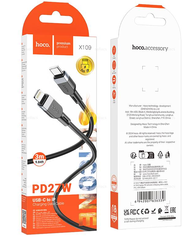КАБЕЛЬ 8PIN HOCO X109 3M PD 27W TYPE-C TO IPH