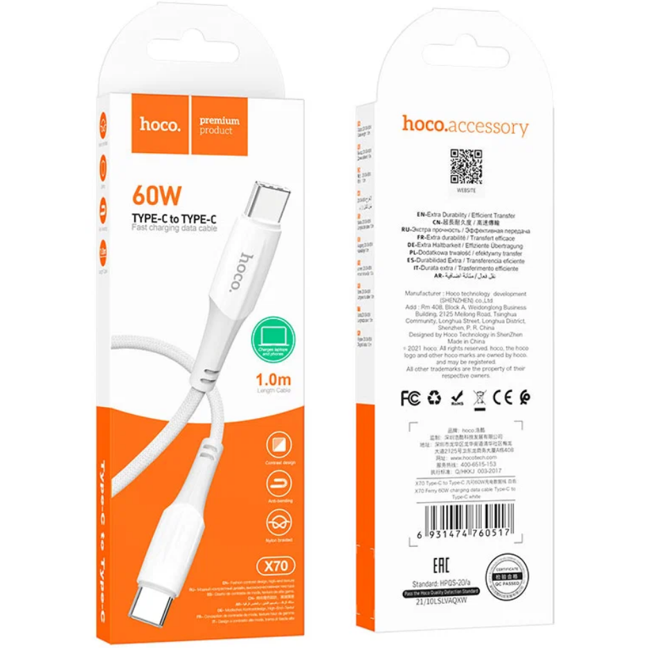 КАБЕЛЬ TYPE-C HOCO X70 TYPE-C TO TYPE-C 60W 1M